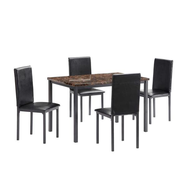 5-Piece Kitchen Table Set with Marble Top, 4 Durable black faux leather upholstery Chairs Perfect for Kitchen-Brown